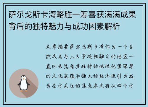 文章摘要:萨尔戈斯卡湾,作为一个自然风光与人文景观相融合的地区,一直以来凭借其独特的地理优势、深厚的文化底蕴和强大的经济吸引力,成为各方关注的焦点。本文将从四个方面深入分析萨尔戈斯卡湾在取得卓越成果背...