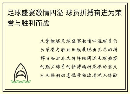 文章概述:足球盛宴激情四溢,球员们为荣誉与胜利而战,展现出无尽的拼搏与奋进。本文将详细阐述足球盛宴的魅力,球员的拼搏精神,荣誉的意义,以及胜利的喜悦,带领读者深入体验这个激情无限的体育世界。1、足球盛...