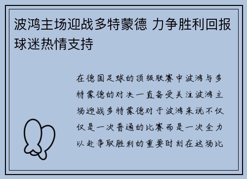 在德国足球的顶级联赛中,波鸿与多特蒙德的对决一直备受关注。波鸿主场迎战多特蒙德,对于波鸿来说,不仅仅是一次普通的比赛,而是一次全力以赴争取胜利的重要时刻。在这场比赛中,波鸿的目标不仅仅是争取积分,更是...