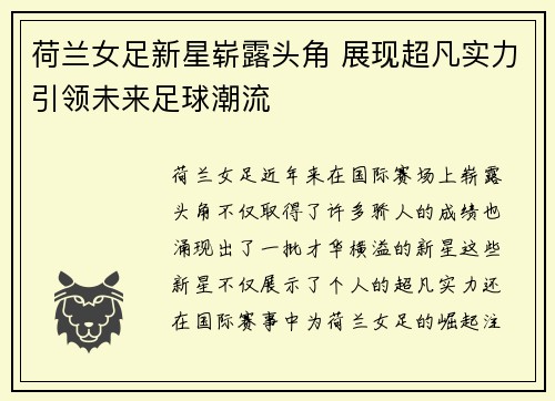 荷兰女足近年来在国际赛场上崭露头角,不仅取得了许多骄人的成绩,也涌现出了一批才华横溢的新星。这些新星不仅展示了个人的超凡实力,还在国际赛事中为荷兰女足的崛起注入了强大动力。她们的表现不仅给荷兰女足带来...