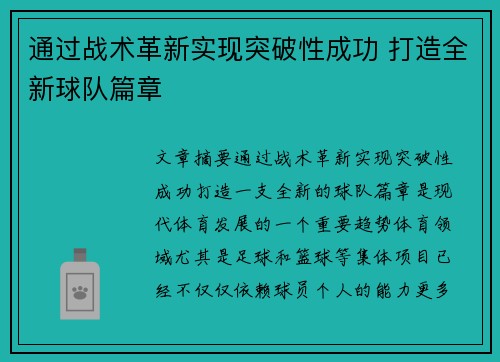 文章摘要:通过战术革新实现突破性成功,打造一支全新的球队篇章是现代体育发展的一个重要趋势。体育领域,尤其是足球和篮球等集体项目,已经不仅仅依赖球员个人的能力,更多的是依赖于整个团队的战术配合和技术体系...