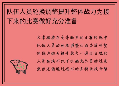文章摘要:在竞争激烈的比赛环境中,队伍人员的轮换调整已成为提升整体战力的关键手段之一。通过合理的人员轮换,不仅可以避免队员的过度疲劳,还能通过战术的多样化提升整体的竞技水平。本文将从四个方面详细阐述如...